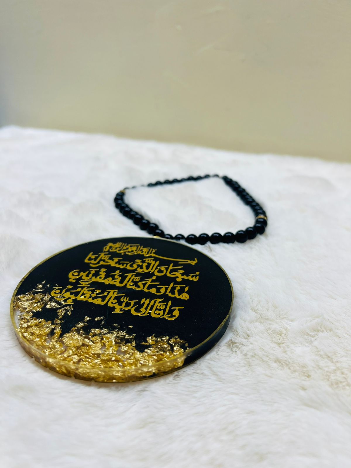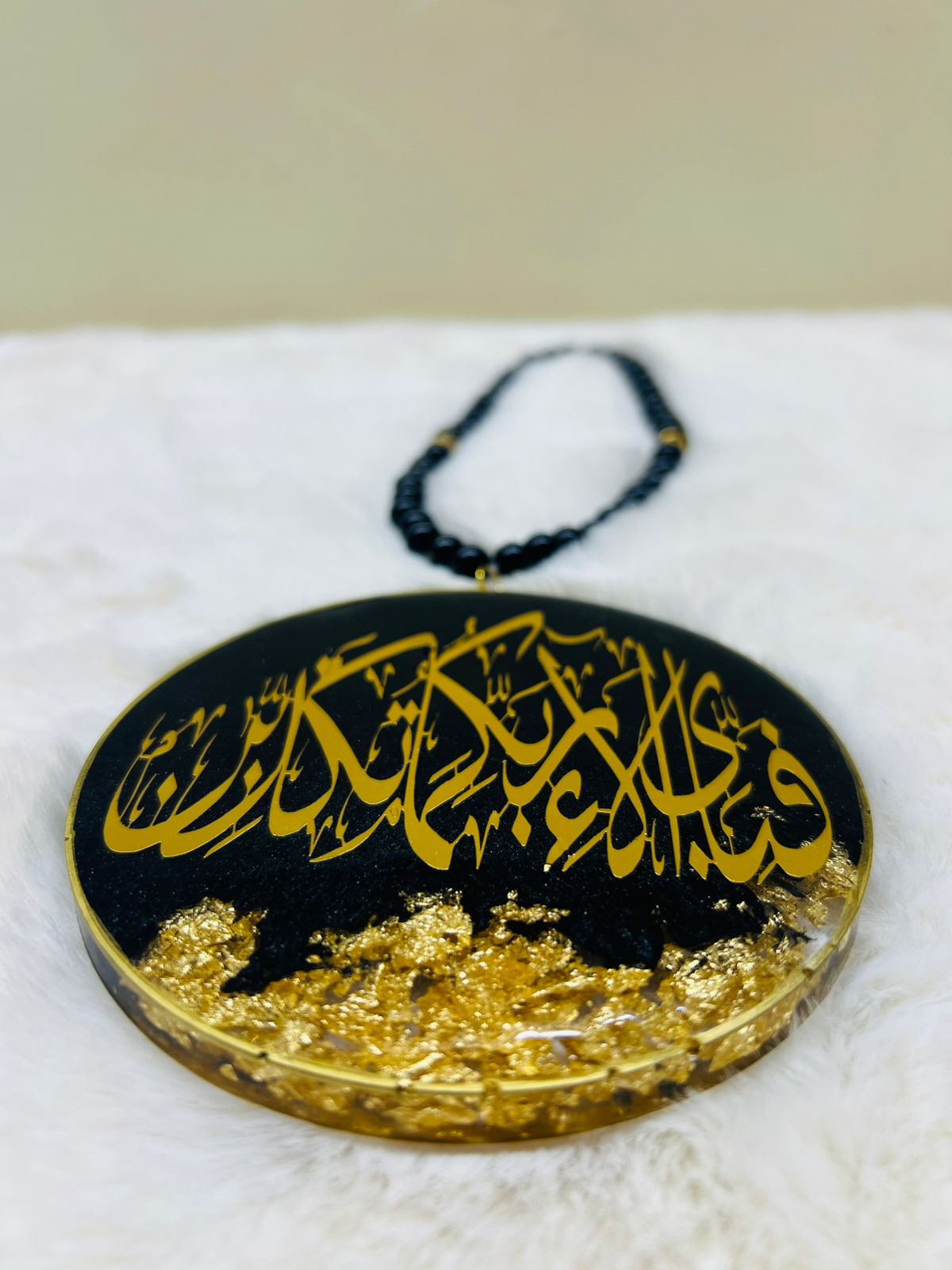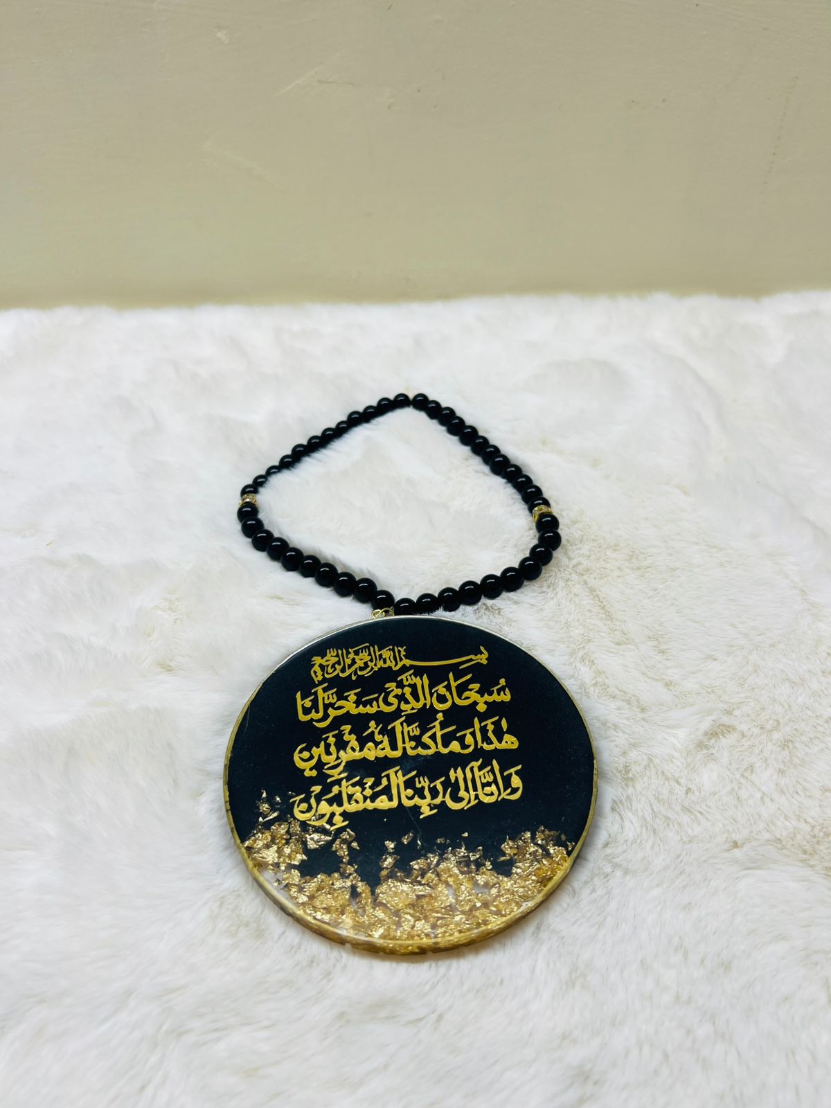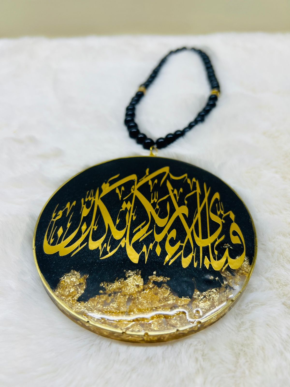 Crafted in a rich black resin base with elegant gold Arabic calligraphy and embedded gold flakes, this car hanging is finished with a black beaded chain, making it both lightweight and stylish for rear-view mirrors.