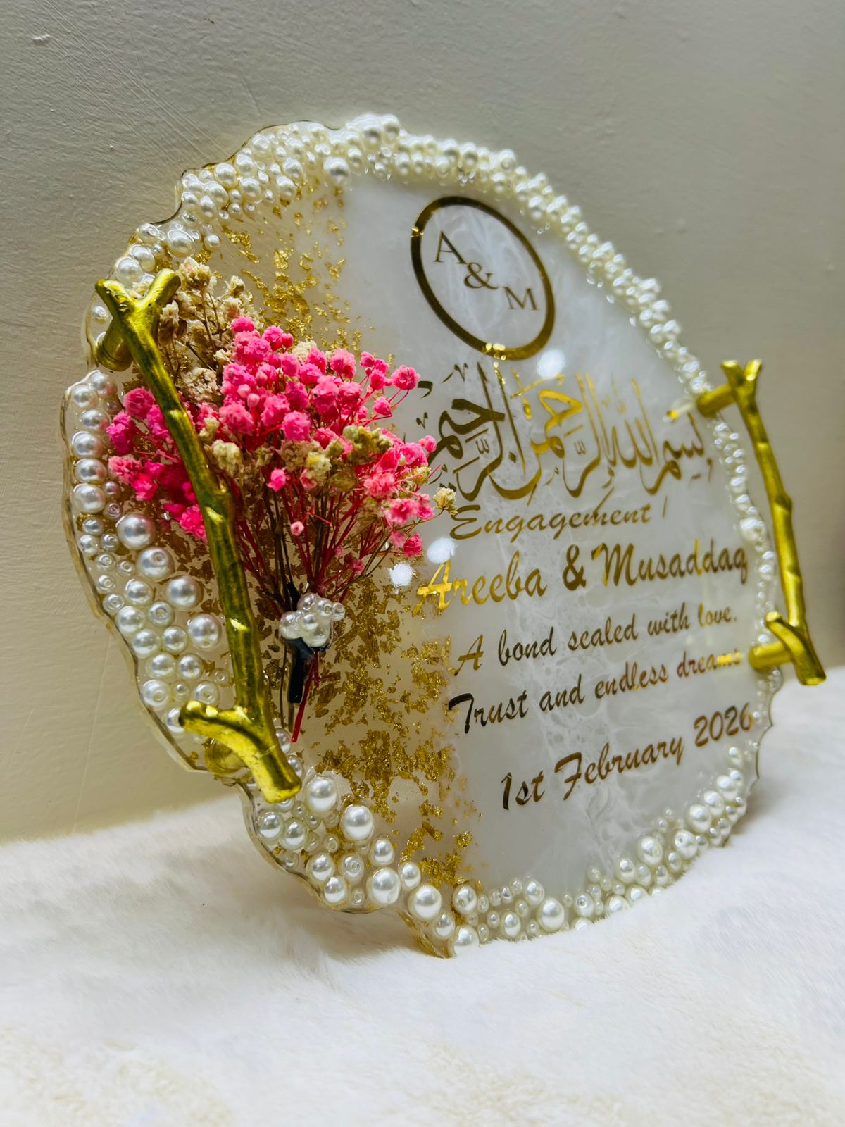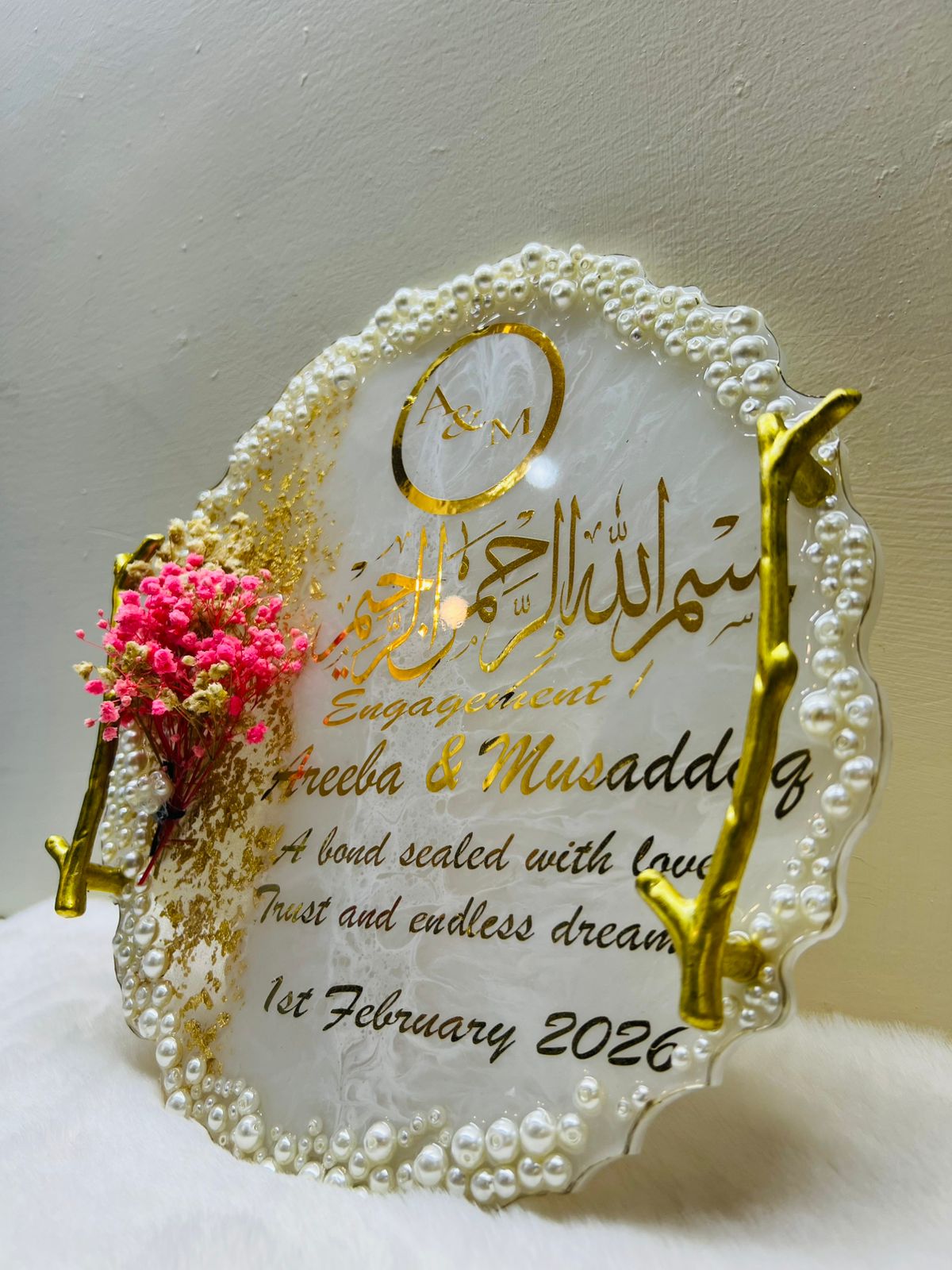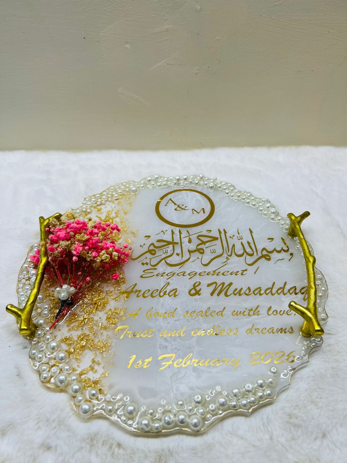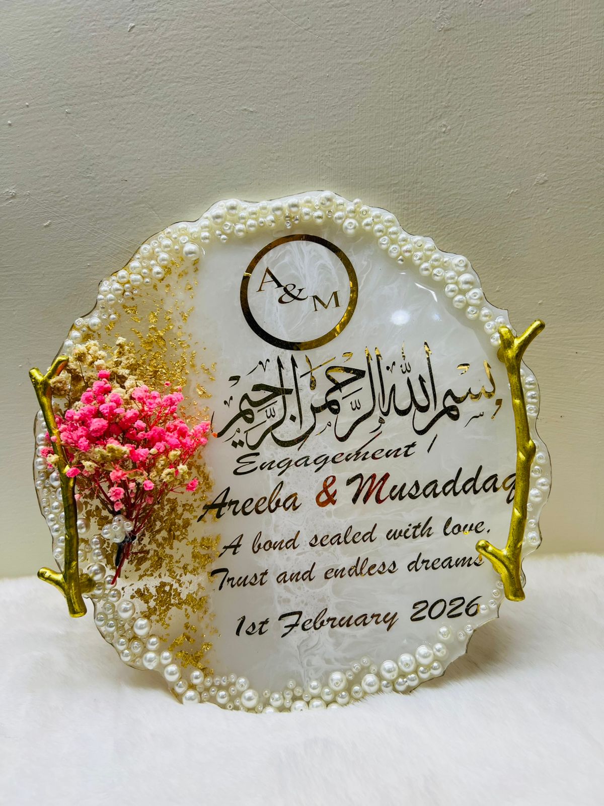Celebrate a beautiful beginning with this luxury handmade resin engagement platter, thoughtfully designed to preserve memories that last forever. Crafted with love, this elegant piece features Islamic calligraphy (Bismillah-ir-Rahman-ir-Raheem), delicate pearls, golden accents, and preserved florals — making it a timeless keepsake for a special milestone.