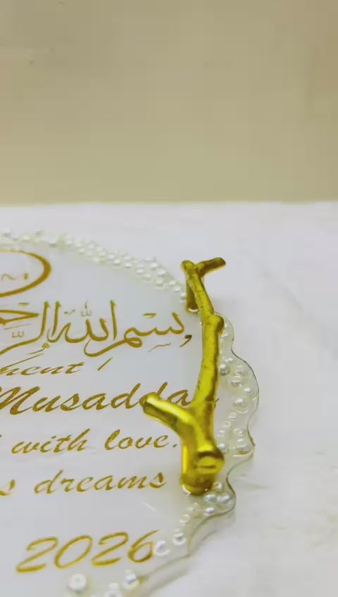 Personalized Resin Engagement Platter – Islamic Calligraphy with Pearls & Gold Leaf