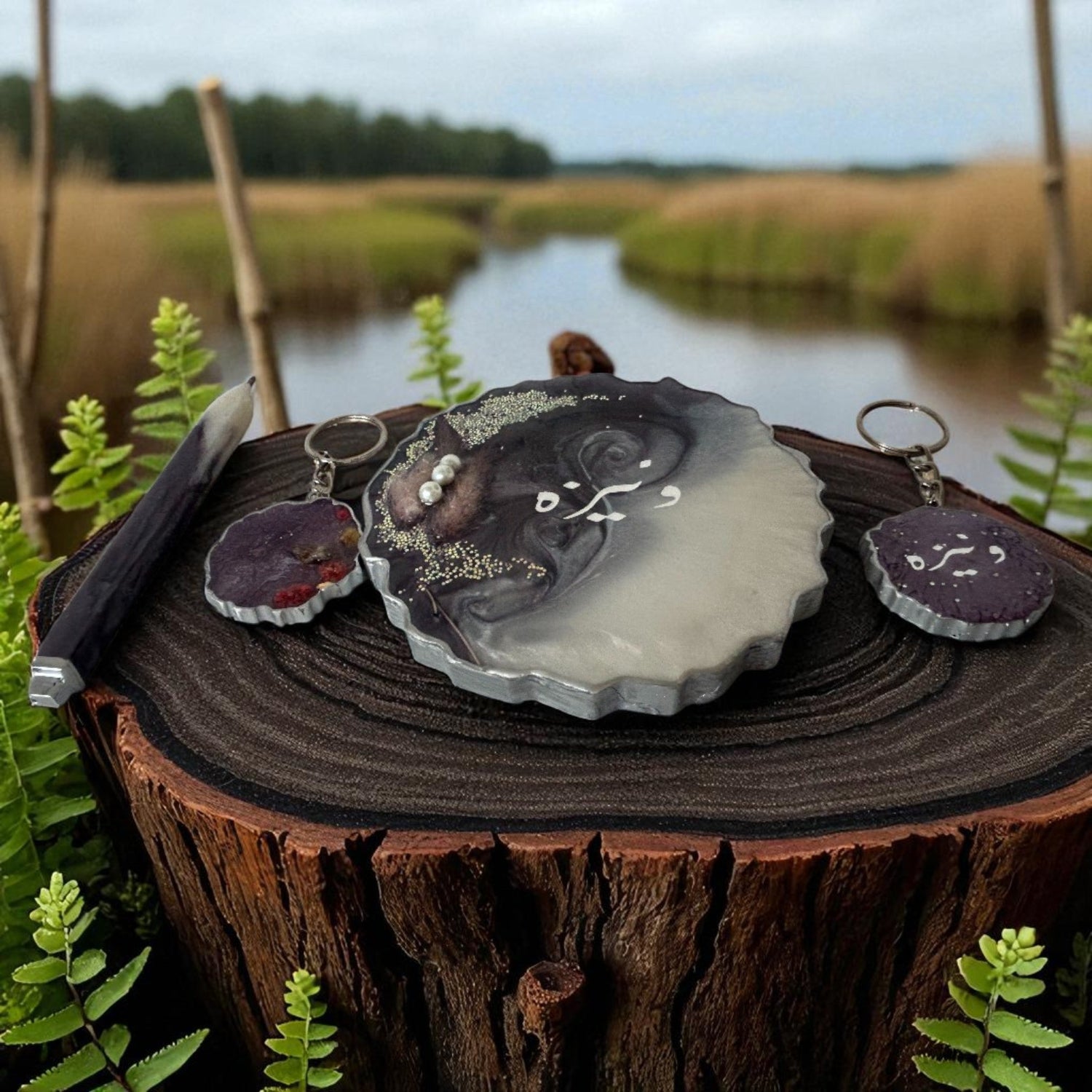 • Includes 1 resin coaster, 2 keychains, and 1 pen