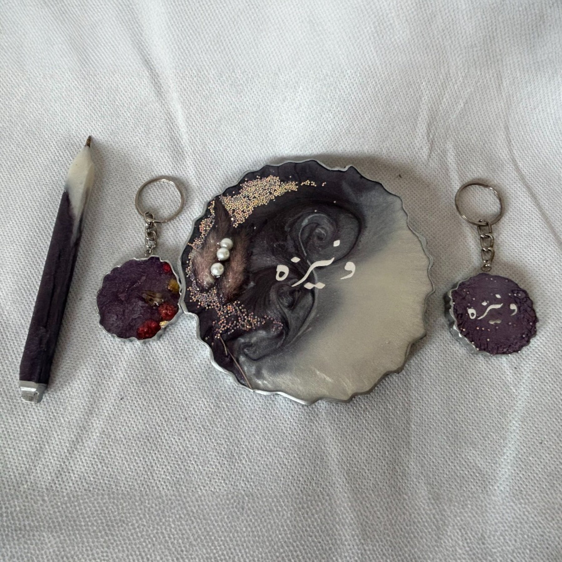 Make every gift personal with this handmade resin gift set featuring a custom name on each item. This beautiful set includes a coaster, matching keychains, and a pen — all crafted from high-quality resin with a glossy finish. Perfect for birthdays, anniversaries, or any occasion to make your loved ones feel special.