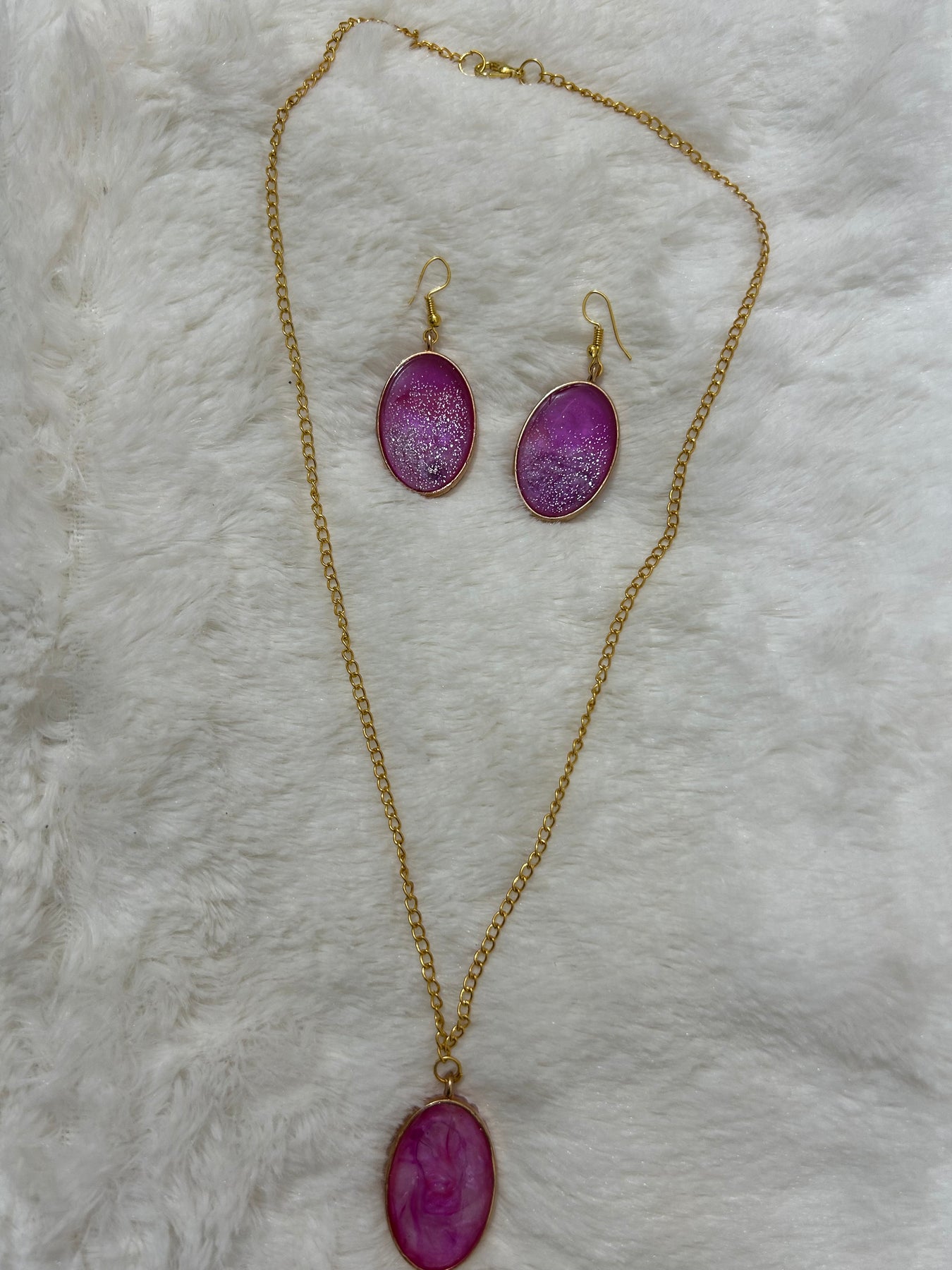 Elegant Pink Resin Locket Chain & Earrings Set – Shiny Finish