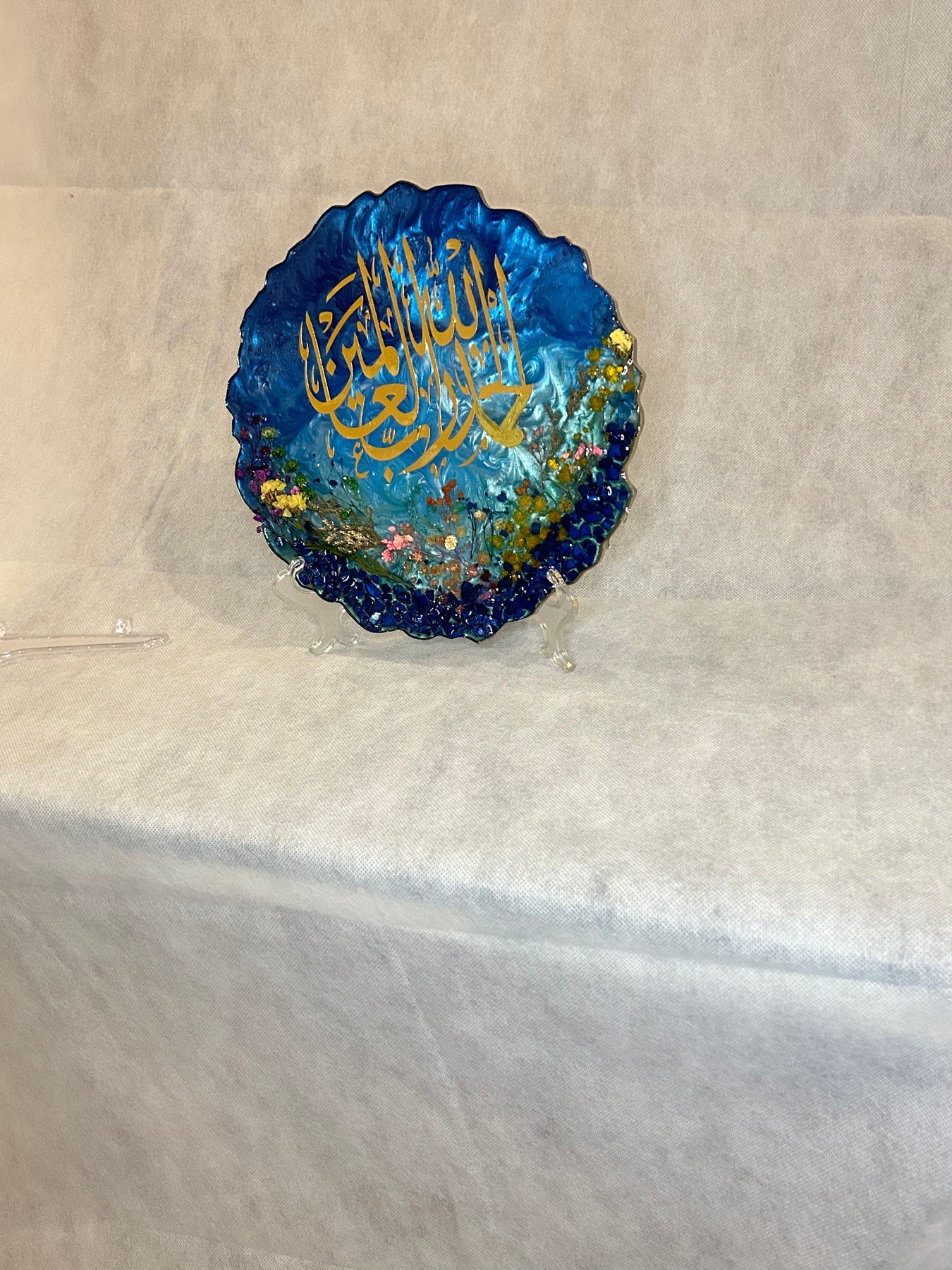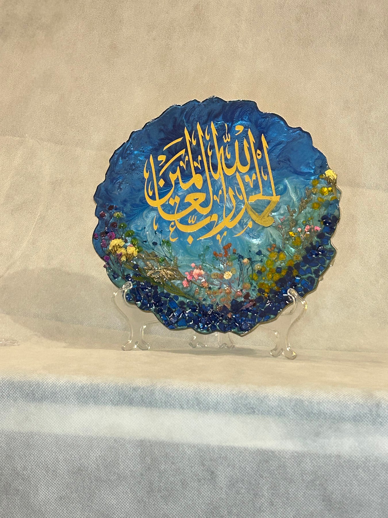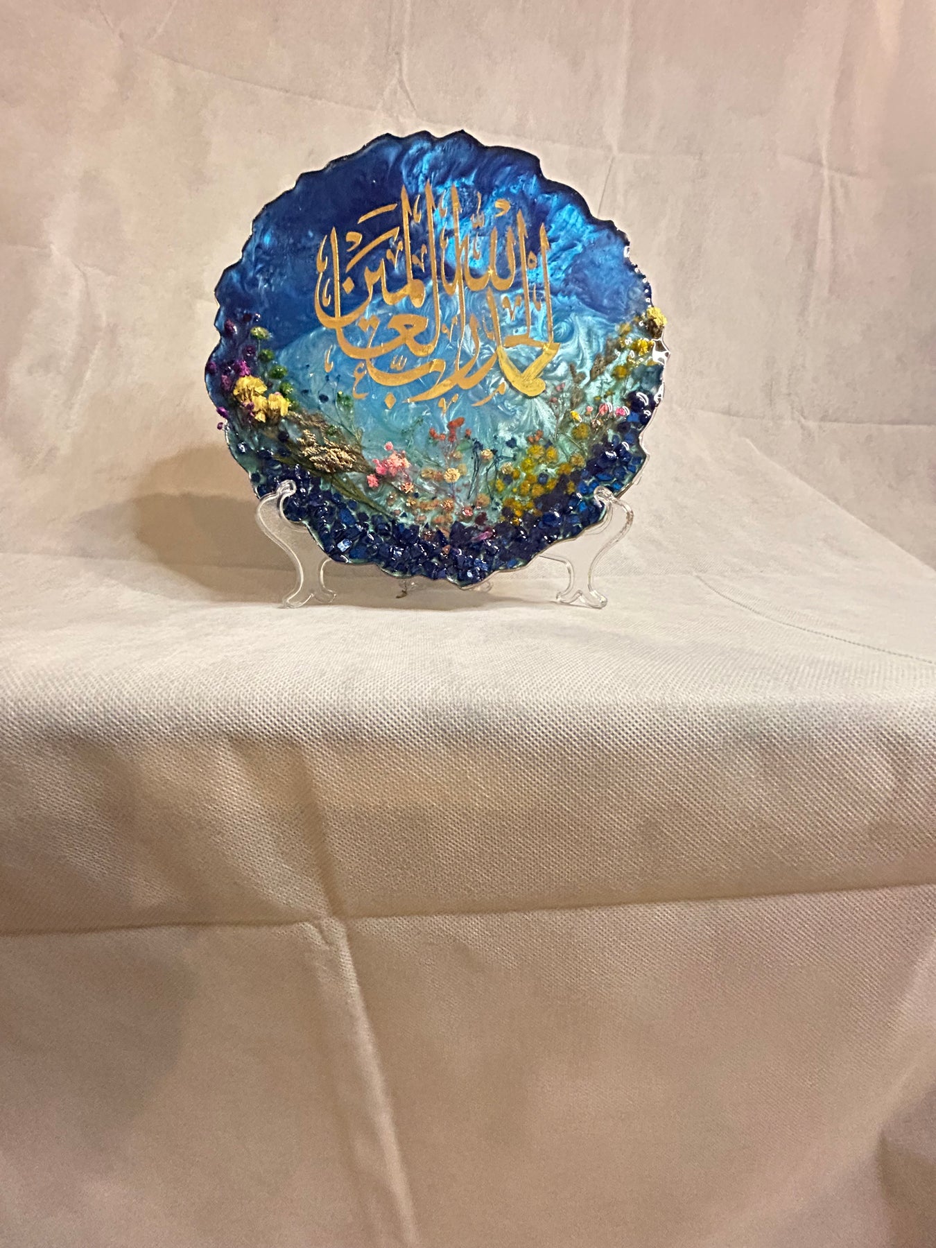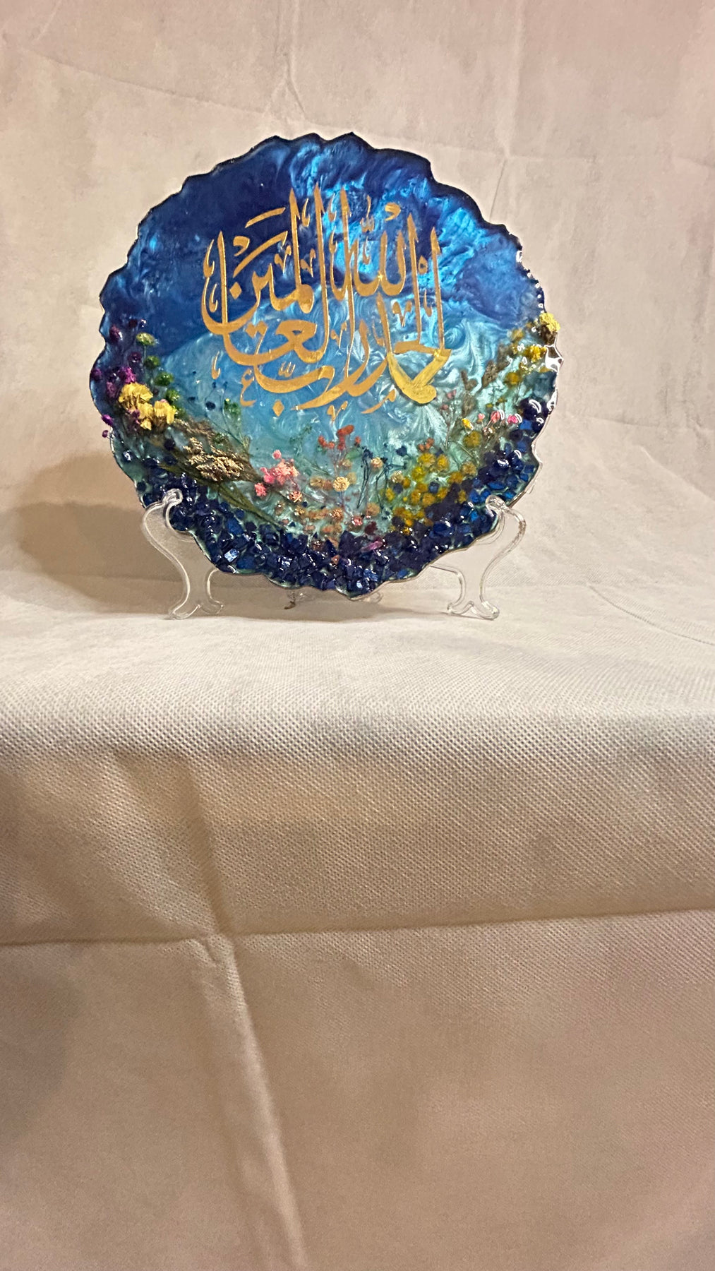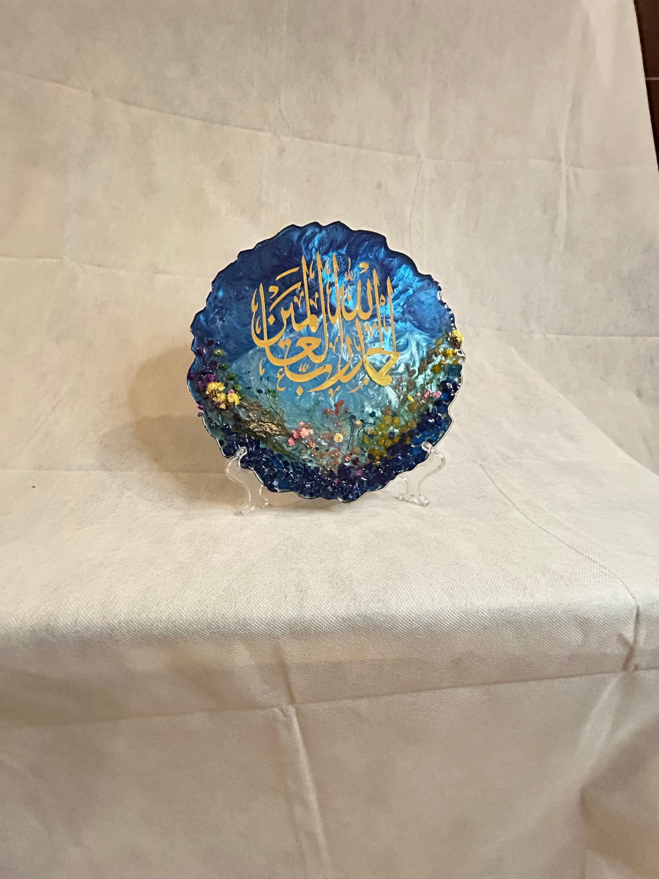 Resin Ocean Blue and gold Alhumdulillah frame with free stand/Chain, Wedding Gift ,Islamic Decoration Pieces, Ayat ul kursi Frame decor