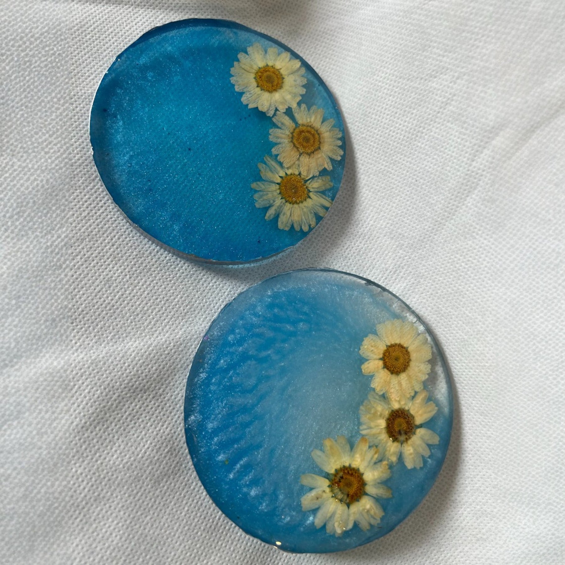 Sea Blue Resin Tea Coaster Set – Round Shape with Real white Preserved Flowers (2 Pieces)