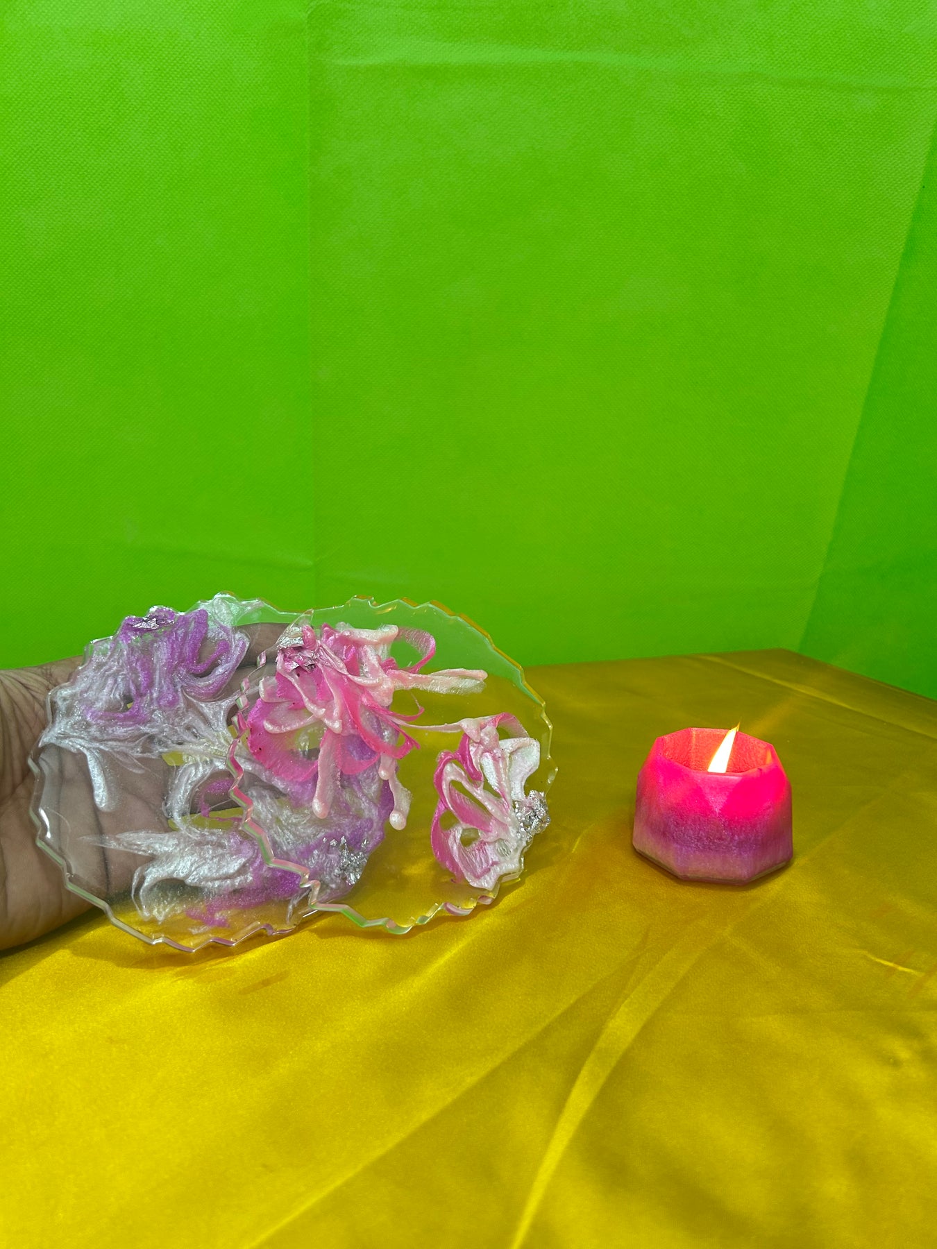 Handmade Beautiful Blush Pink crystal tea coasters with free candle.