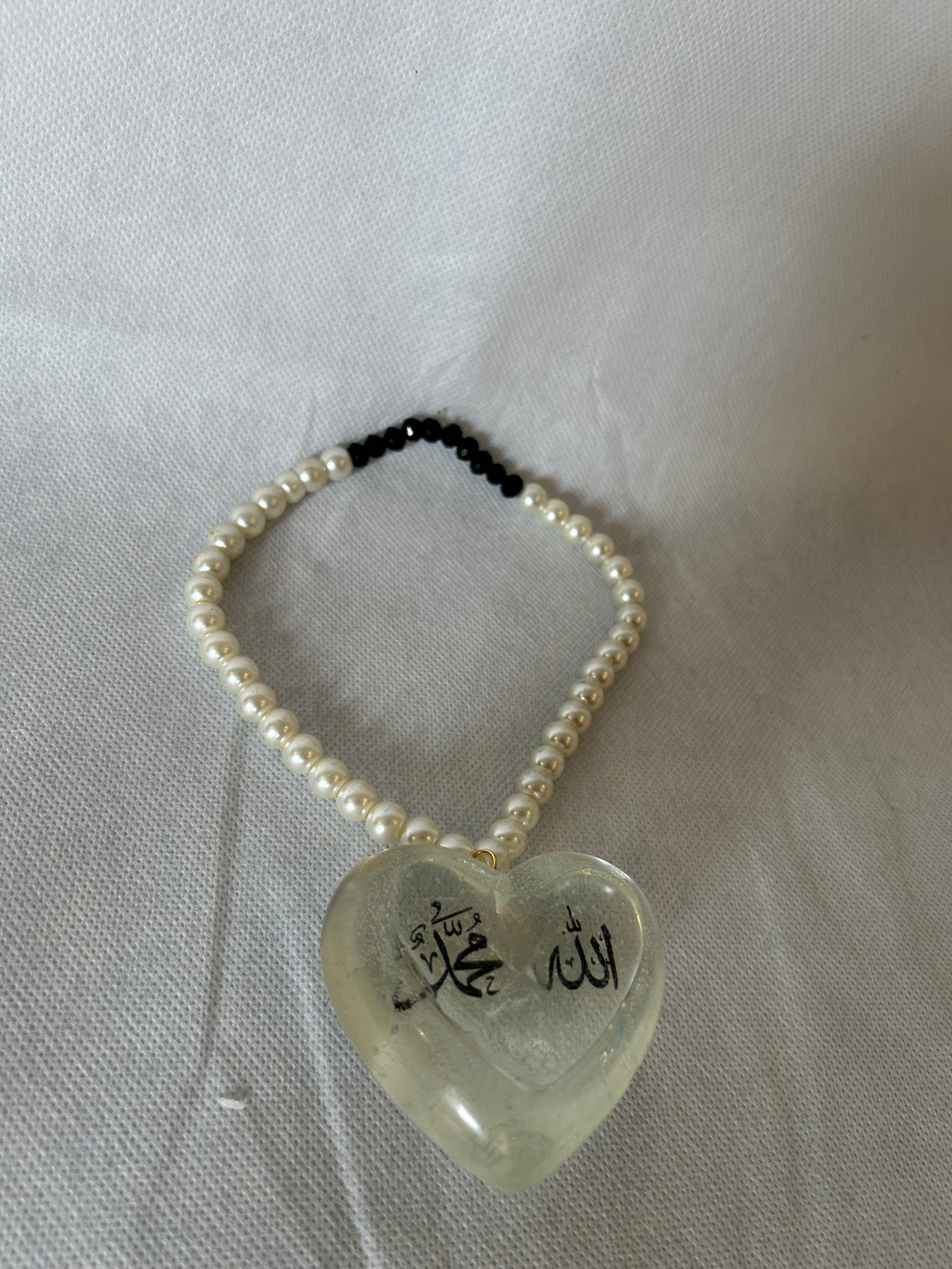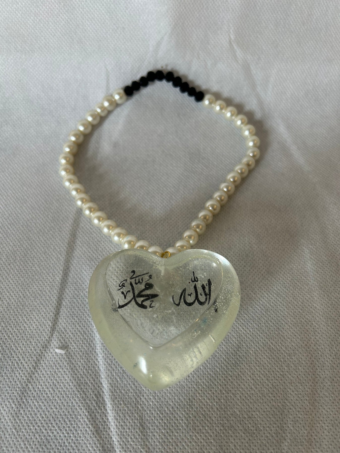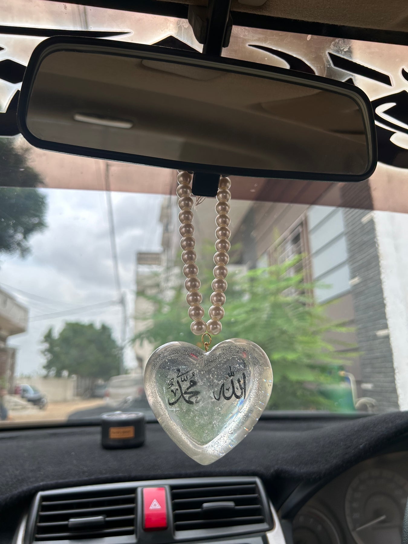 Bring beauty and faith together with this handmade transparent resin 3D heart-shaped car hanging, featuring Allah and Muhammad calligraphy inserts inside. The clear resin design creates a stunning floating effect, making it a unique and eye-catching accessory for your car or home.
